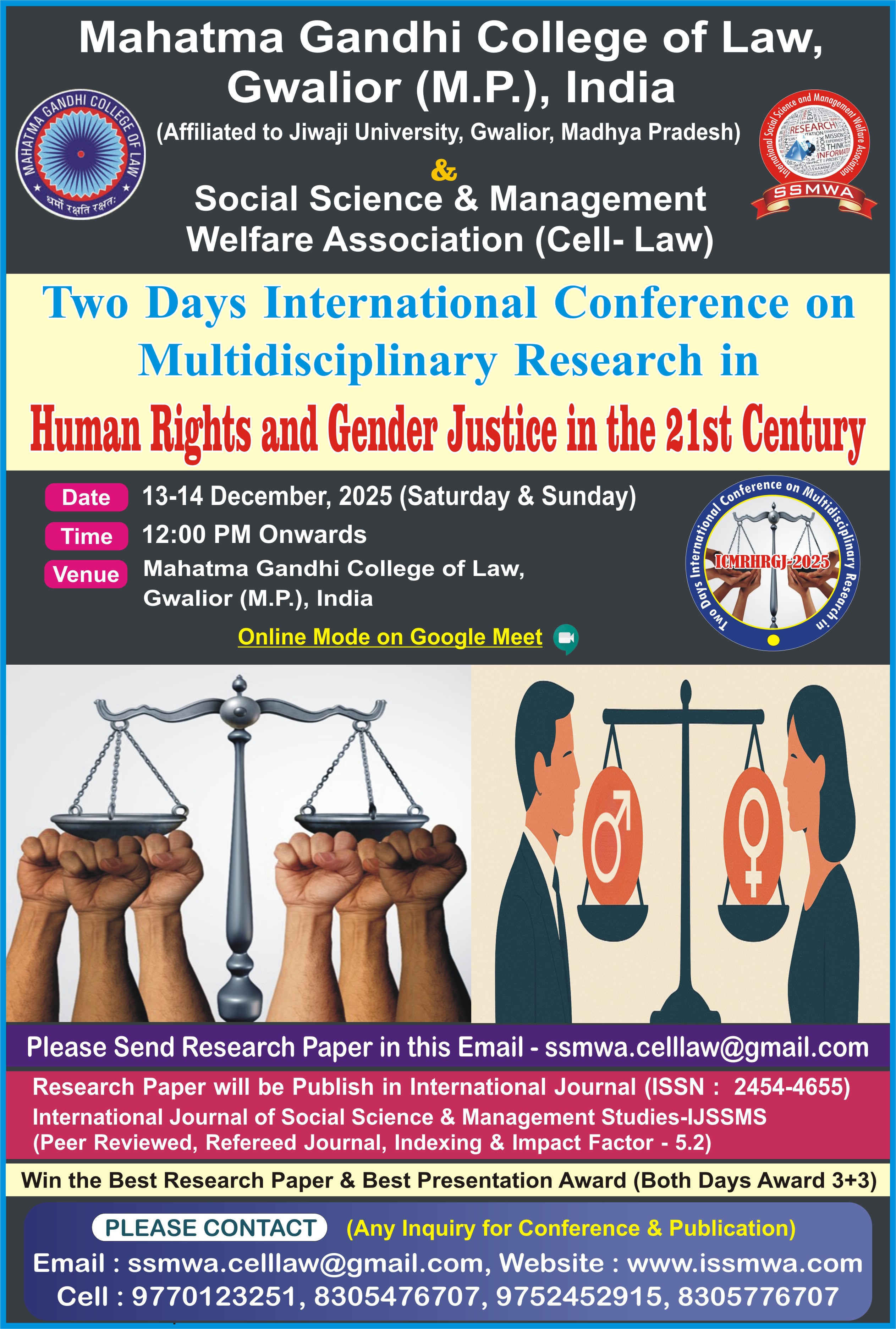 13-14 December, 2025 (Saturday & Sunday), Mahatma Gandhi College of Law, Gwalior (M.P.), India (Online Mode on Google Meet) |